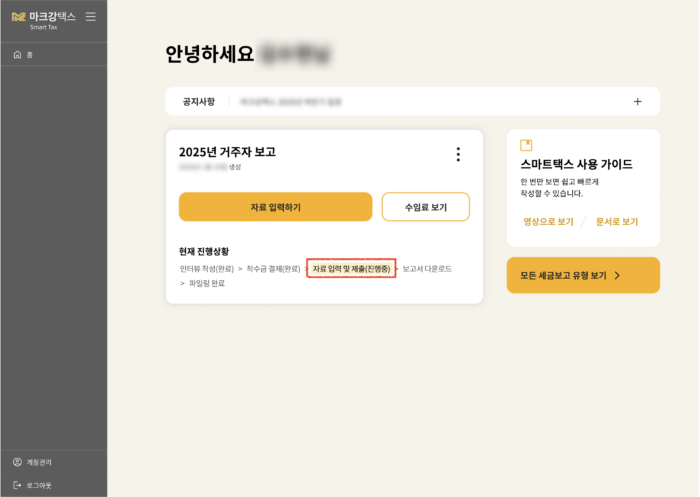 1. 착수금 결제 후, 대시보드에서 진행중인 세금보고의 ‘자료입력’ 단계가 활성화된 것을 확인합니다.