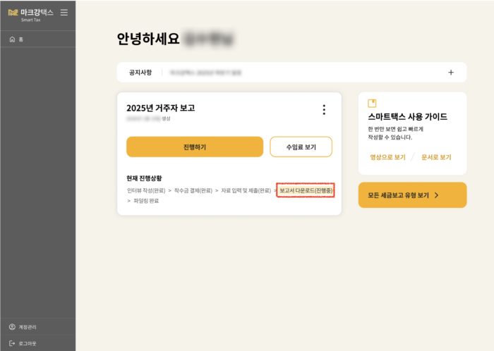 홈의 진행중인 세금보고 케이스에서 ‘보고서 다운로드’ 단계가 활성화됩니다.