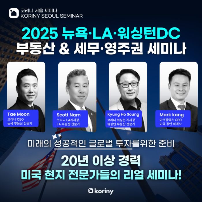 글로벌 부동산 및 세무·영주권 전략을 한자리에서 확인할 수 있는 ‘2025 뉴욕·LA·워싱턴DC 부동산 & 세무·영주권 세미나’가 오는 10월 20일부터 24일까지 서울 강남에서 5일간 개최될 예정입니다.